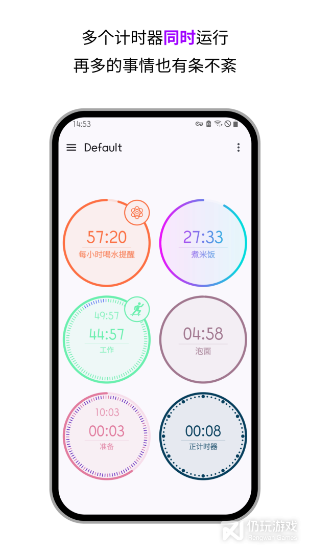 2、能够支持多个计时器同时运行,让计时更加准确,使用简单,只需要轻松一点,就可以运行多个计时器,还有多种背景颜色可供选择,用户可以自己喜欢的背景颜色,不在是单调的黑色了