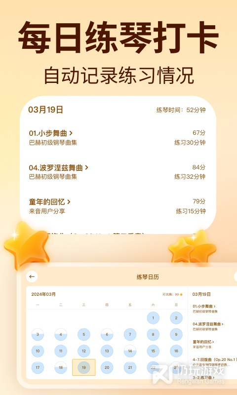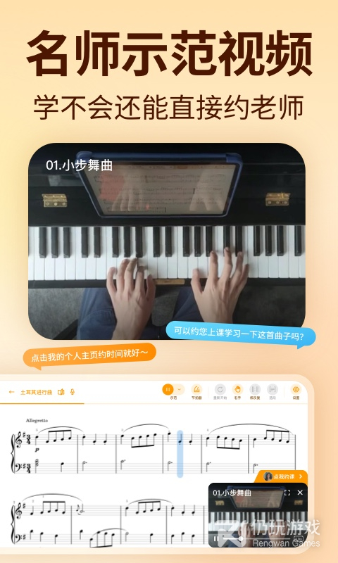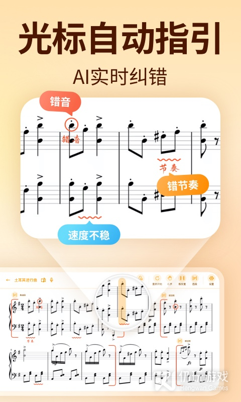 1、跟弹练谱有效果弹奏练习时音符有光标移动指引,练琴节奏自己掌握,想怎么弹就怎么弹
