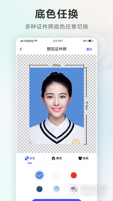 5、支持自拍模式,拍到你满意为止。快速添加男女正装衣服,一键美颜,即可告别丑丑的证件照。还可快速换底色,一键操作,方便简单