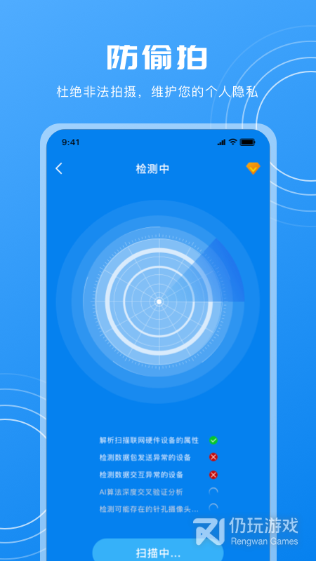 1、通过扫描wifi连接设备的方式来找出陌生可疑设备,从而判断是否是非法摄像头。软件会深度检测并扫描设备,手机、电脑、音箱等任何需要连接网络的设备都可以扫描出来