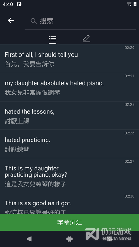 中英文字幕切换、字幕预览/查找、字幕词汇分析、添加笔记、收藏句子、上一句/下一句字幕跳转、单句字幕循环播放、无级变速播放、屏幕查词、离线下载视频、导出音频和字幕、加载手机本地存储卡的视频/字幕......