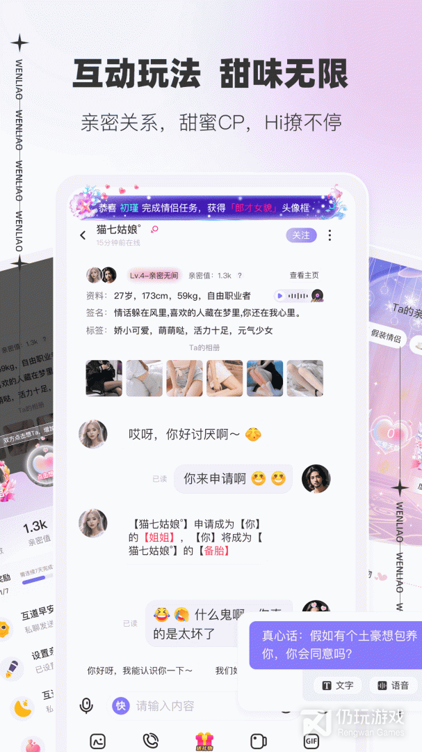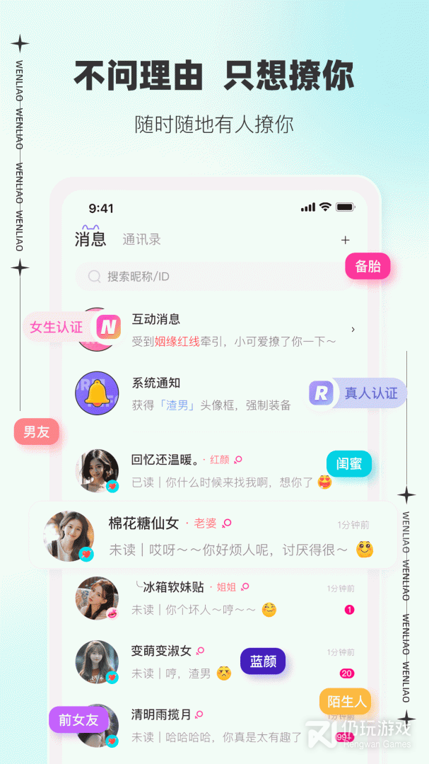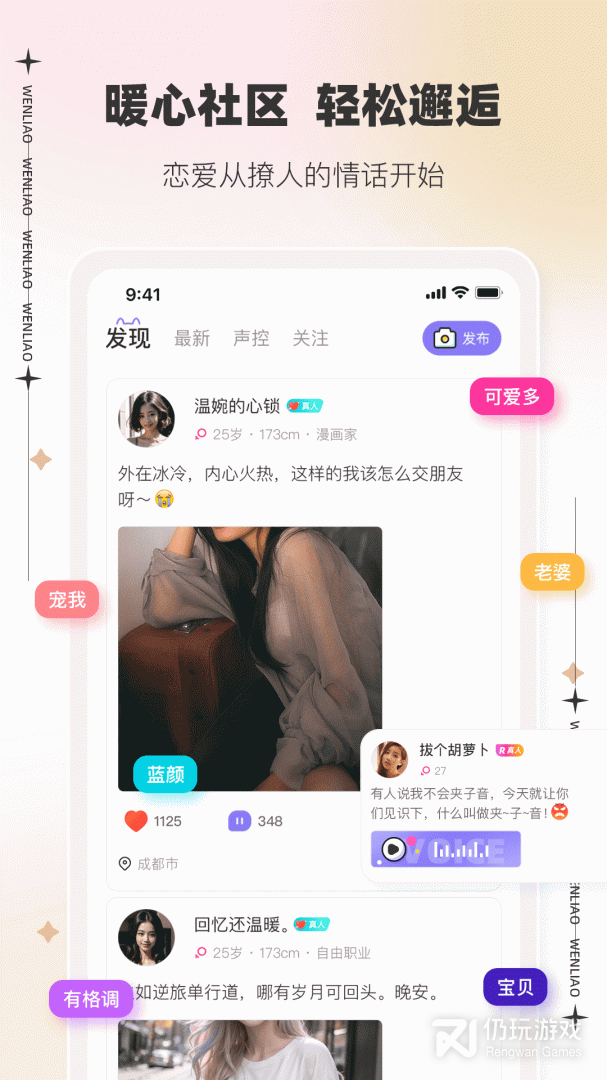 1、文撩下载,一款多元化智能化的社交互动平台,来文撩小伙伴们可以随时发布各类趣味话题,在线聊天互动,更可以处cp约会,感兴趣就来下载