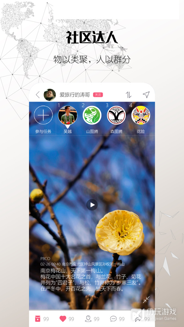 3、在这里你的生活状态随时都能通过短视频记录下来,和小伙伴们共同分享~更有超多趣味任务等你来做,边发短视频边做地图任务,做完就有奖励领取哦~趣味寻宝小游戏带你边玩边,通过挖掘宝藏来获取回报~基于lbs技术,随时随地都能认识周边好友,一起共享生活状态、互动交流~