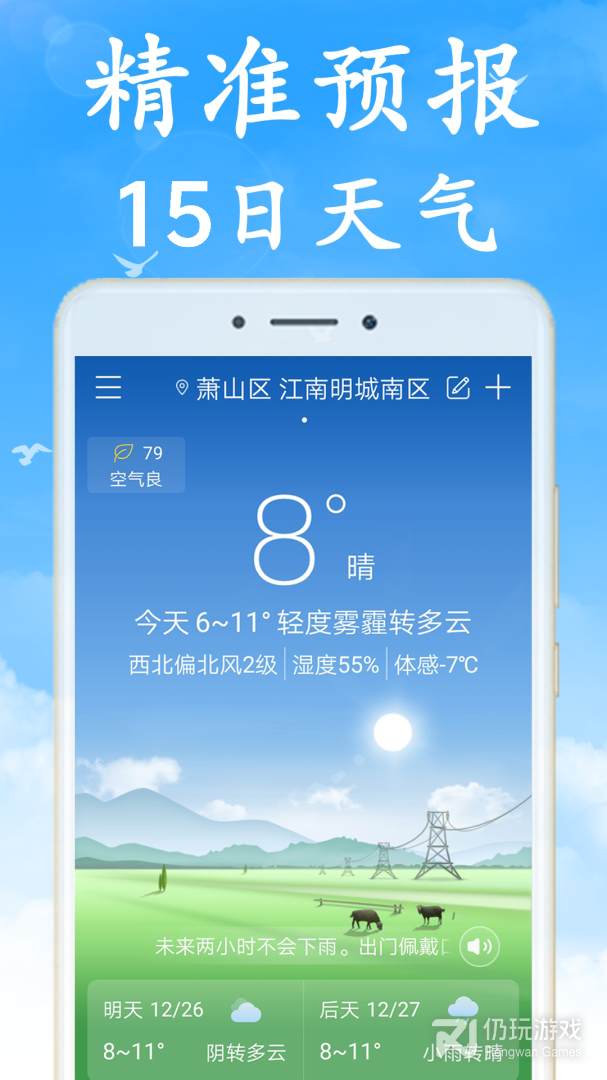 3.天气:天气动态实时更新、未来一周天气、PM2.5污染提醒、紫外线强度提醒;