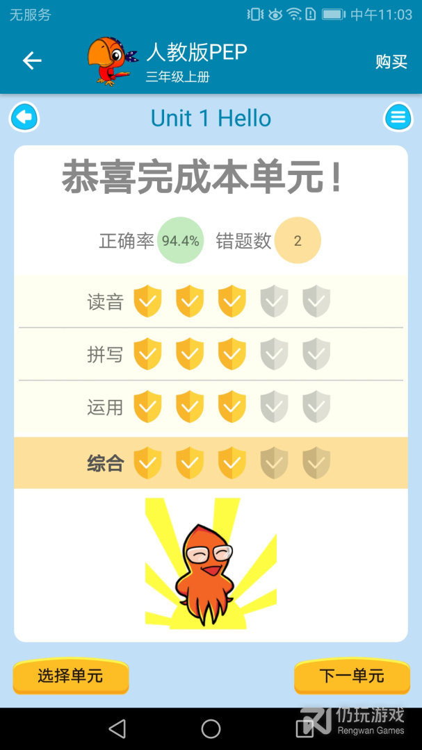 6、 支持游戏通过模式进行单元测验和单词记忆,让学习过程欢乐有趣,让小朋友跟随小鱿一起学好英语,爱上英语!