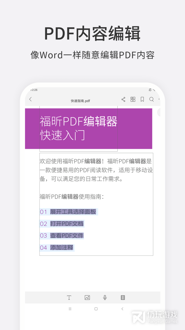 1、适用于安卓设备,支持随时随地查看和注释PDF文件。同时,福昕高级PDF编辑器还提供高级功能,您可以通过订阅获得更多PDF功能,包括导出PDF、编辑PDF和保护PDF等