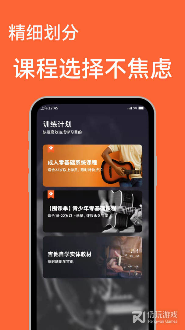 1、吉他自学是一个学习吉他的平台,app里有众多优质课程,适合不同学习进度的用户,用户没有基础也不用担心,入门兴趣课可以让用户很快的上手掌握,还有更高阶的课程,对吉他有兴趣的朋友千万不要错过了