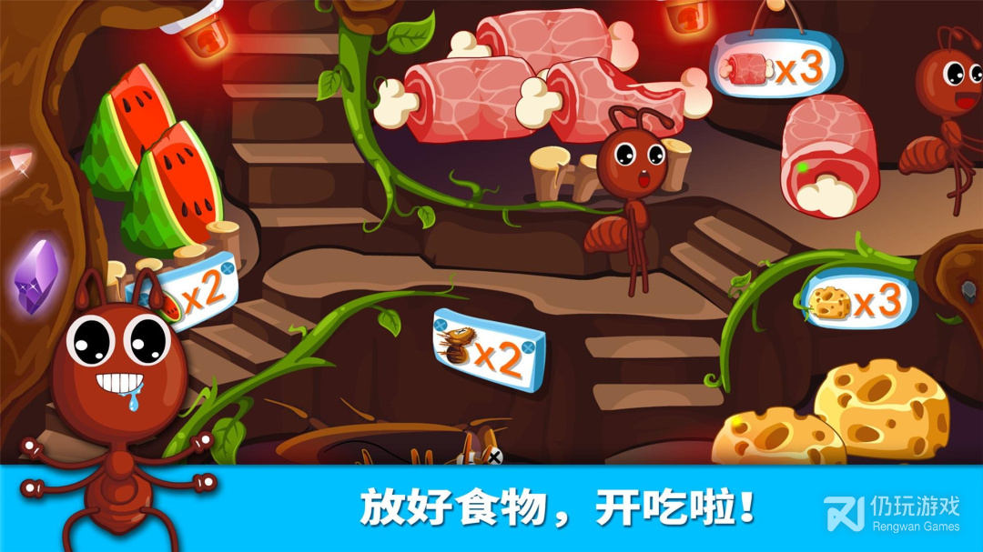 3、等等,还有在地面上辛勤觅食的工蚁们,他们遇到抢食物的坏家伙啦,快和兵蚁一起帮他们渡过难关吧!!