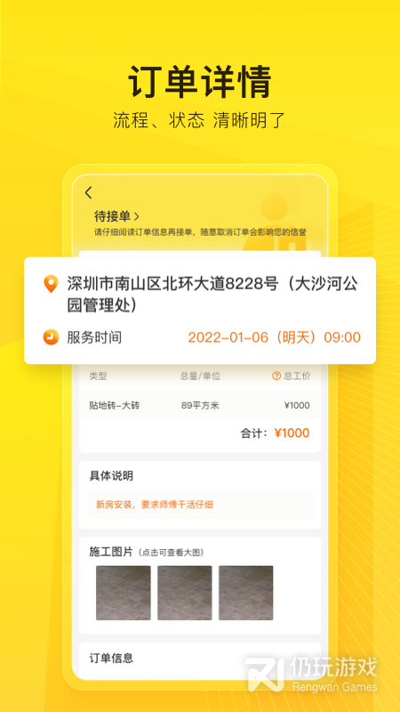 4、工人可以随时在线快速的接单,了解不同的订单信息带来的高效