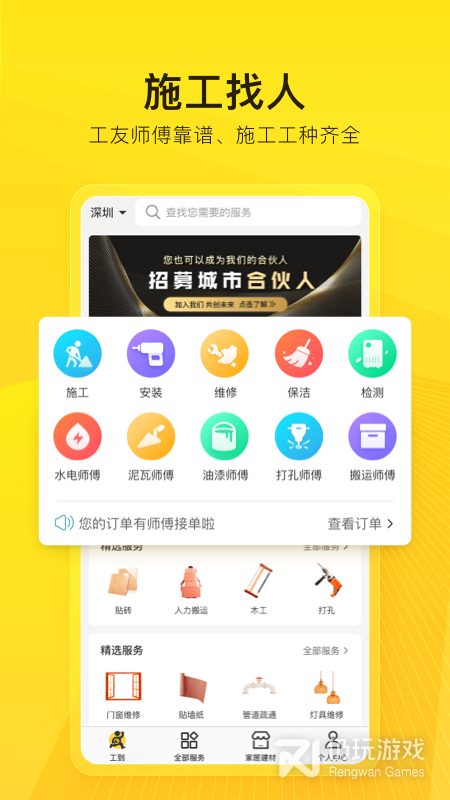 3、使用方法简单,在这里工友师傅靠谱、施工工种齐全,可以随时查找需要的服务,包含了施工、安装、维修、水电师傅、油漆师傅等专区,辅助用户轻松解决施工装修用人问题,使用吧