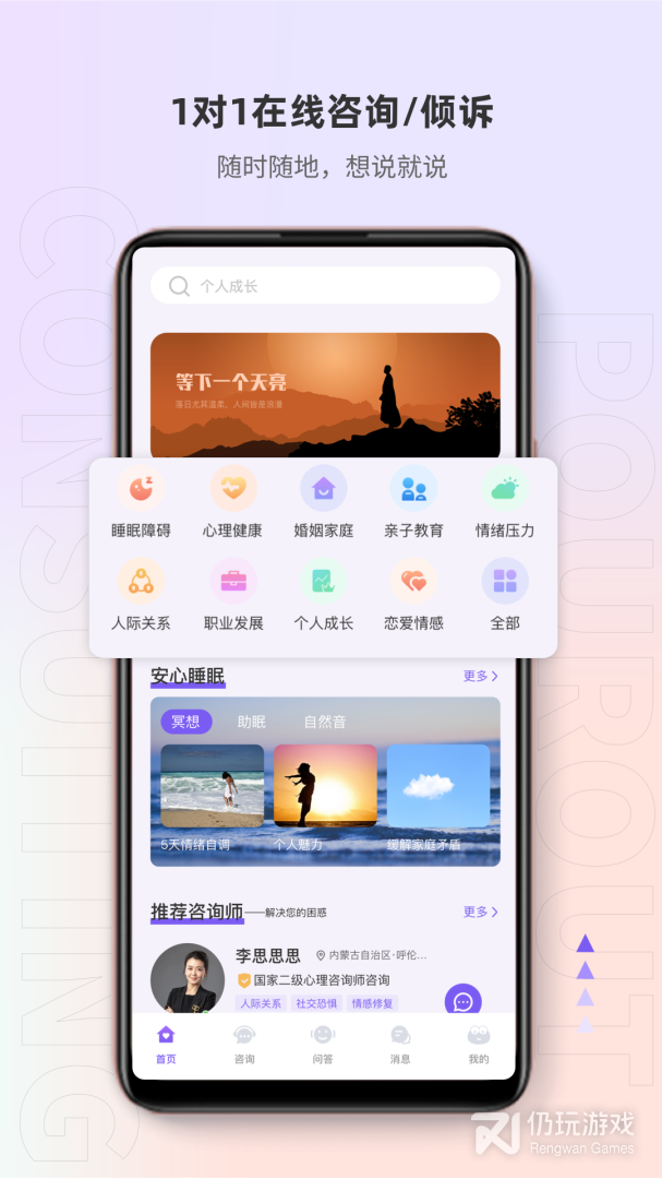 【心理咨询】心理咨询师等专业人士全天在线,抑郁焦虑、情绪压力、职场发展、失眠、社交恐惧、自卑等各类问题,多种选择,助您排忧减压;