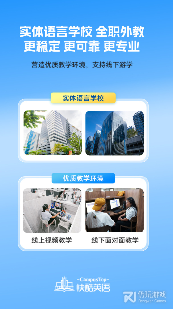【教学基地、师资介绍】快酷英语在菲律宾宿务市拥有两所专业的语言学校,占地面积10000平米,目前在校的全职外教约有1300余人,通过线上互联方式服务的学员遍及中国、日本、泰国、巴西、俄罗斯、越南等国家。