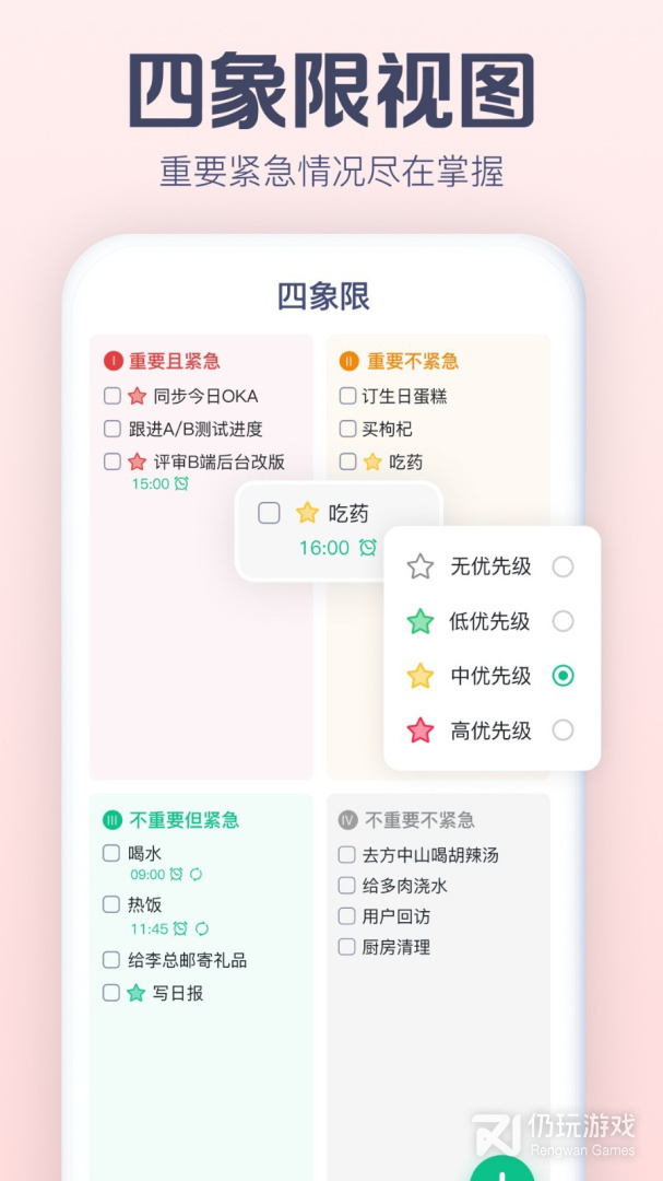 1、致力帮助用户更轻松的做好自己要做的事情。软件的操作非常的简单,只需要将要做的事情都记录其中,并设置提醒功能即可,这样一旦时间到了就会提醒用户。完成之后进行打卡即可。这样一直坚持下去的话就可以养成良好的习惯