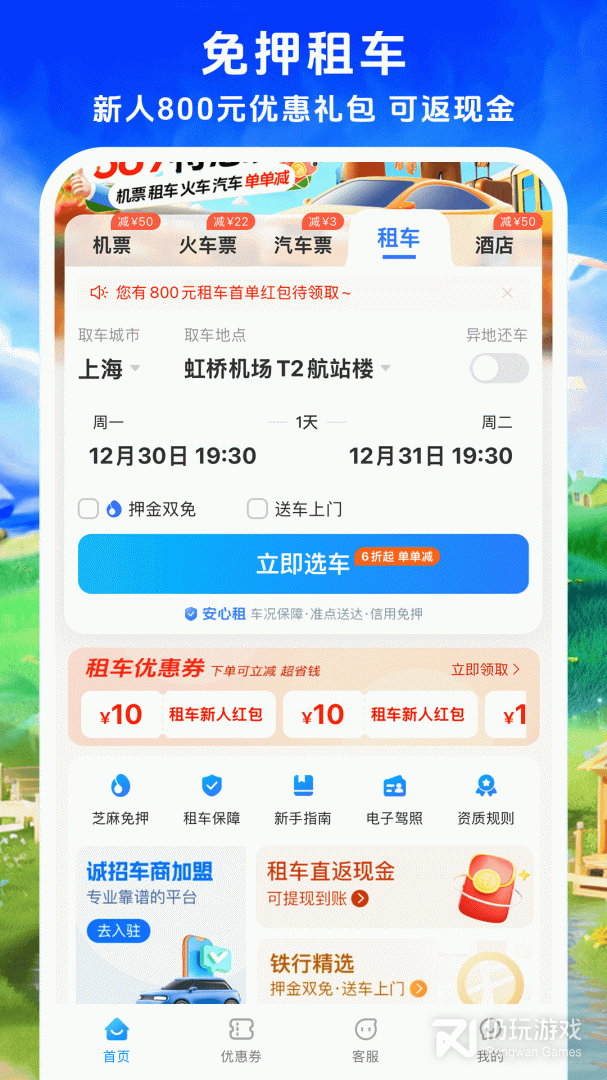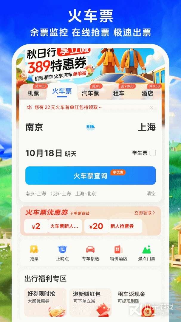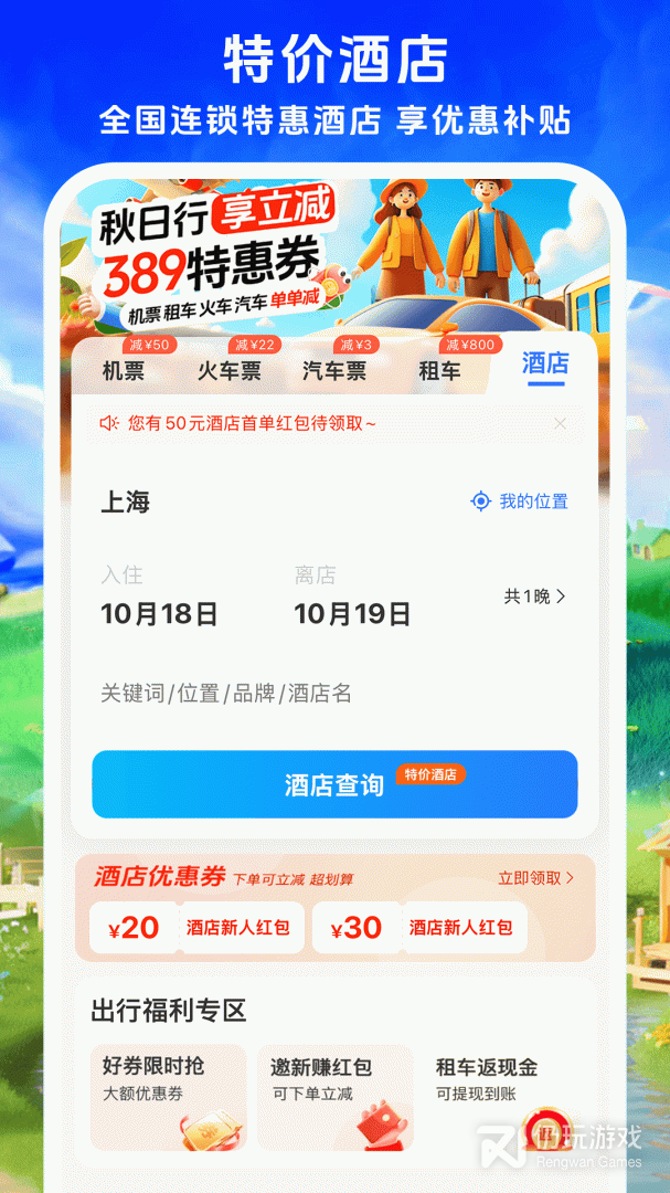 新人专享919元出行大礼包 火车票、机票、租车、汽车票、酒店都可减