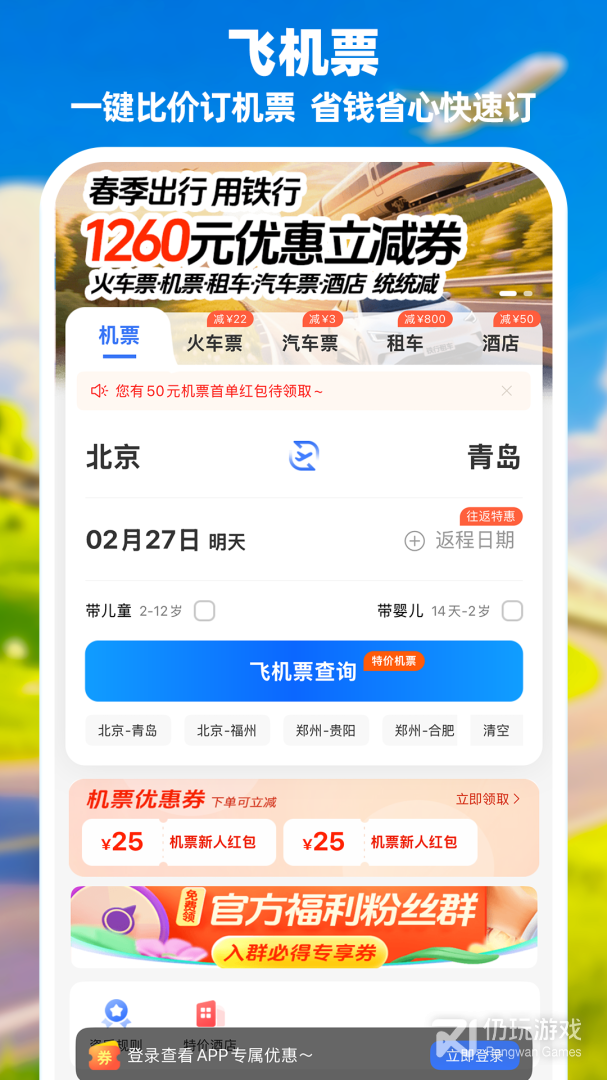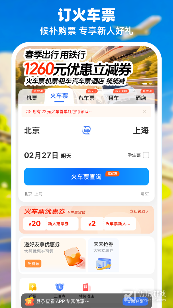 春季1260元专享优惠+新人专享919元出行大礼包 火车票、机票、租车、汽车票、酒店都可减