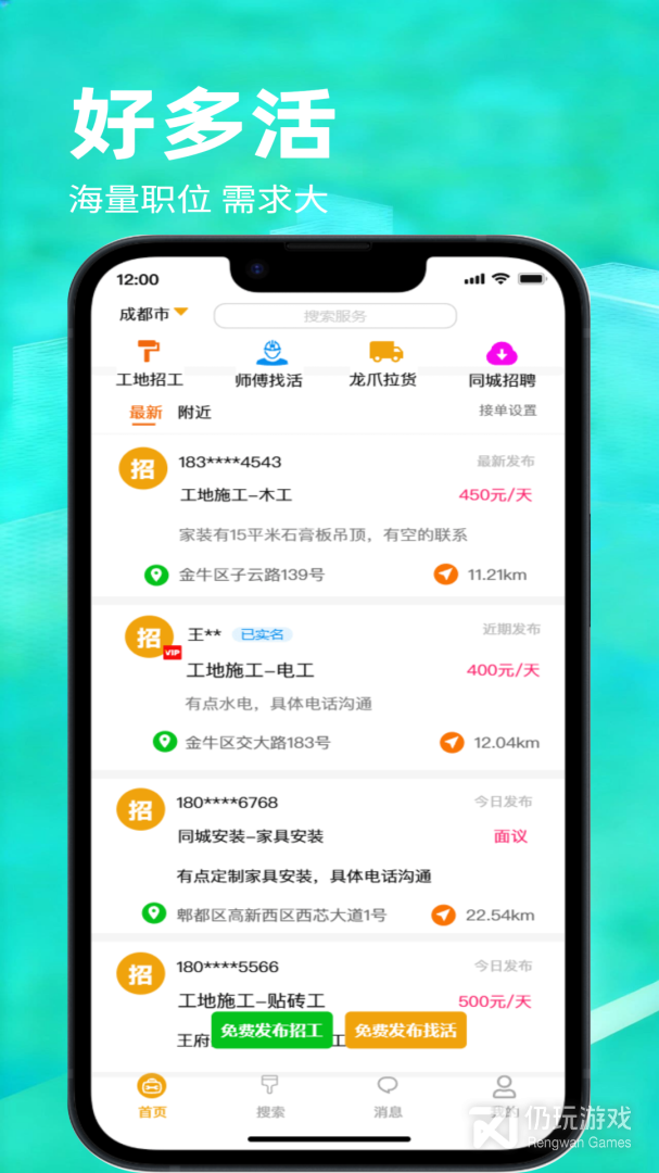 怎然招工对建筑招工与装修招工难以及师傅找活困难,信息不对称而提供解决方案。帮助双方快速实现招工与找活信息对接,是双方快速达成合作。简单发布用工需求,海量优质工人供您选择;附近好活好职位一网打尽,随时随地接单上工,您贴心的接单找活软件。