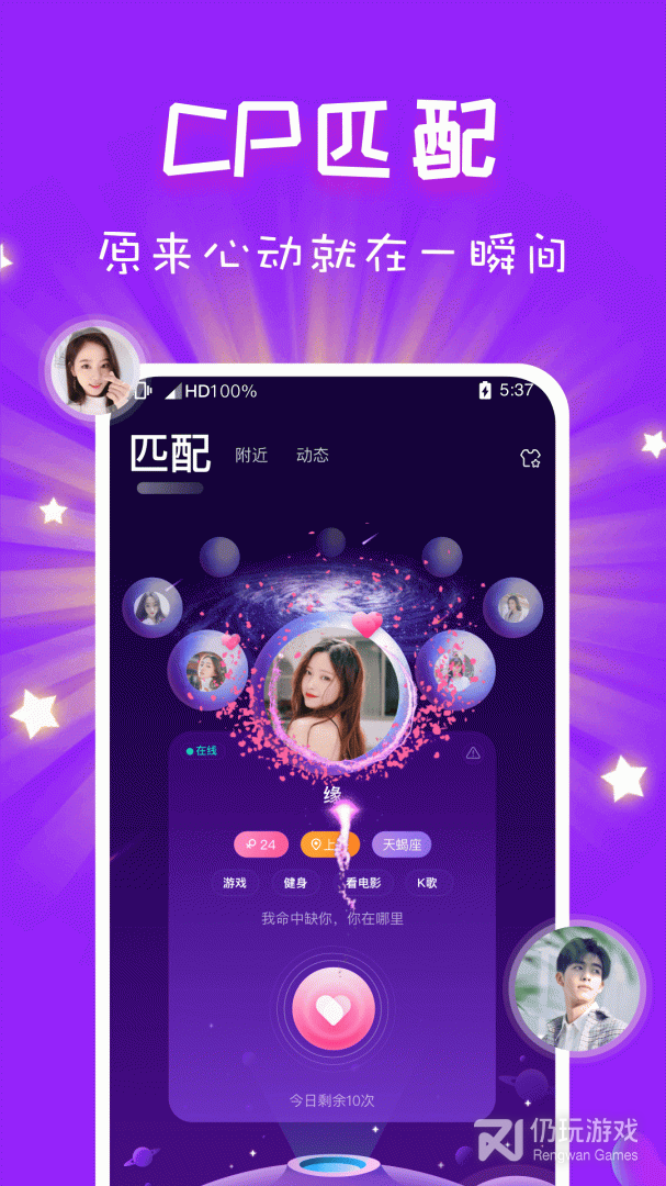 3、CP速配为你一键匹配有趣的灵魂,是情侣娱乐交友聊天必备神器之一,也为广大年轻人打造的语音视频交友平台。CP速配让有趣的灵魂可以快速邂逅,让你不再苦苦烦恼于单身问题,相亲房,K歌房,大咖房等等