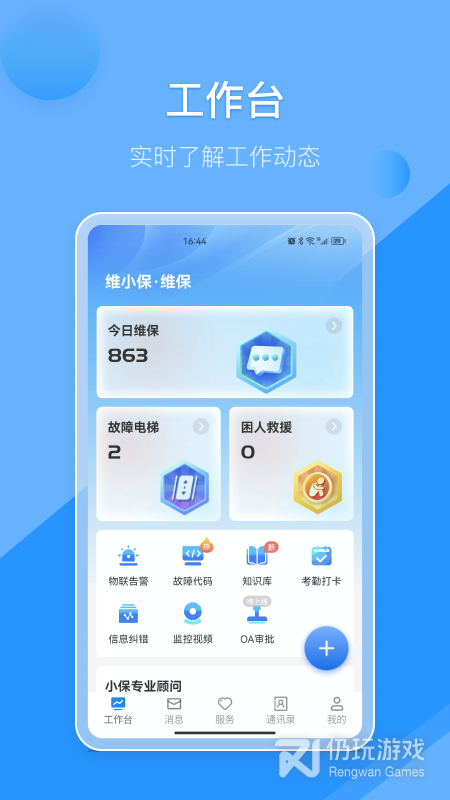 3、维小保维保是浙江新再灵科技股份有限公司为维保人员开发的管理软件。用户在软件上可以查看维修订单,与组内成员交流,以便及时了解任务安排。用户可以在软件上随时提交申报任务、查看信息,在用户发出求救信息时,能及时出动进行救援行动