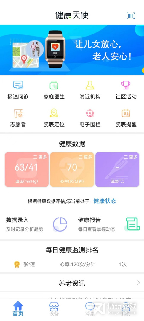 3、老年人需要时刻注意自己的健康状况,健康天使APP能够帮助用户随时随地掌握自己的健康信息,专为老年人打造,软件内有海量专家医生可以在线咨询,发现健康问题时会发出警告,让用户能够及时排除自己身体中的安全隐患,尽早就医