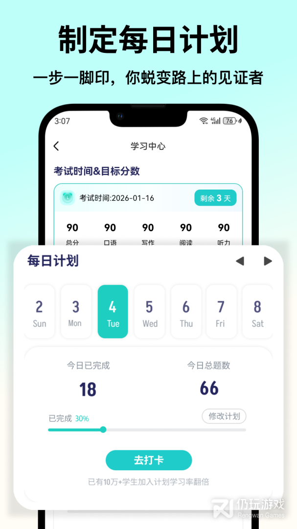 3、每日进行学习打卡,在完成定制的学习任务后,同步记录学习数据