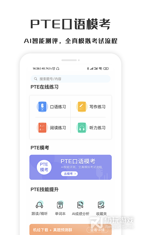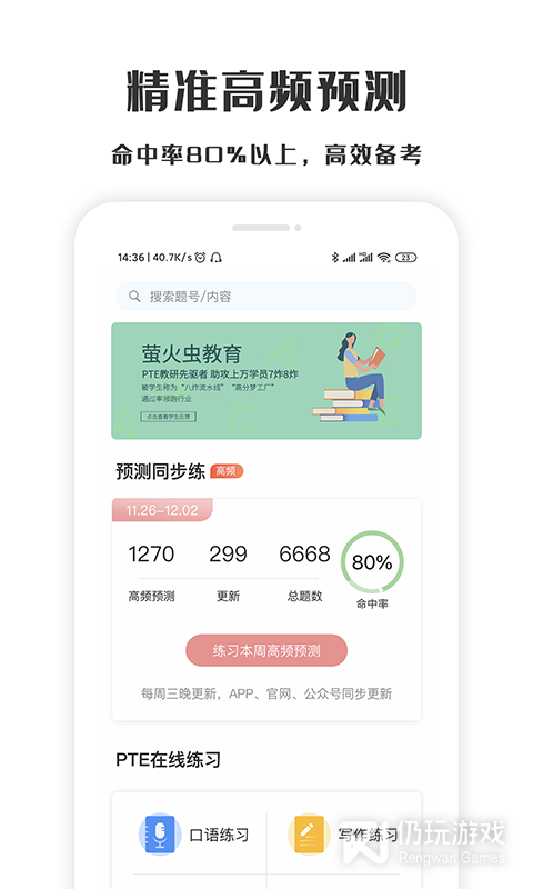2、萤火虫PTE是专为广大PTE备考考生制作,软件拥有预测同步练,AI智能评分,精听练习等等诸多功能服务,可以帮助用户更好的学习备考