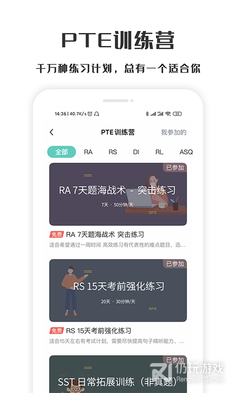 1、萤火虫PTE操作简单,课程丰富,用户可以在手机端享受系统化的考前复习和模拟测试,通过不断练习提升知识水平,在考试时才能有更好的发挥。app还包含了大量听力、写作题型,随时随地强化训练