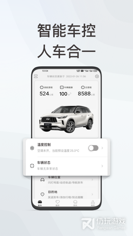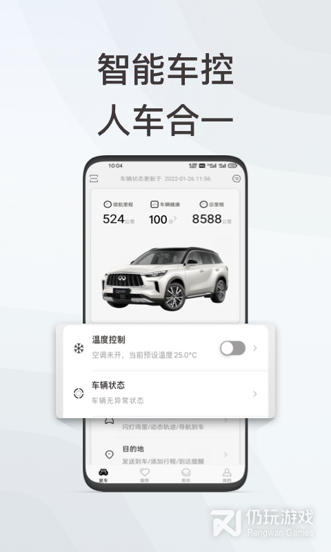 2、可以帮助用户添加车辆开启智能控制,主要服务于英菲尼迪汽车,实时了解车辆状态,包含了续航里程、车辆健康和总里程数据,还有多种汽车服务可以选择,需要的伙伴,即可使用哦