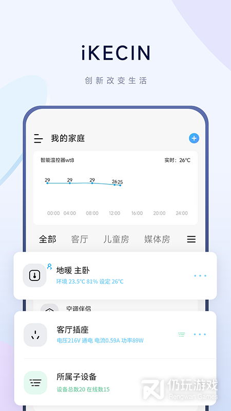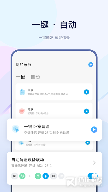 1、支持添加多种智能家居设备,多种情景模式:离家模式、回家模式、睡眠模式等,随时控制、查看设备状态,打造智能家居生活