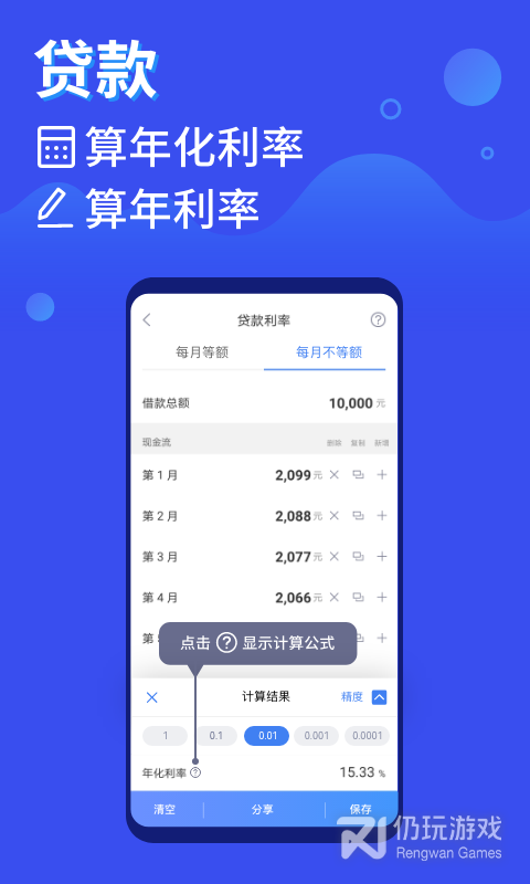 3、拥有内部收益率、日利率换算、理财型保险、融资租赁、梦想基金和攒钱计划等卒读实用功能,操作简单便捷