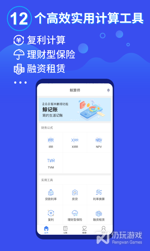 鲸算师是一款帮你管理财务的计算工具。内有内部收益率IRR、净现值NPV、贷款利率、房贷器、日利率换算、理财型保险、融资租赁、梦想基金和攒钱计划等计算器。多种贴心附加功能,让操作更便捷,体验更舒适!