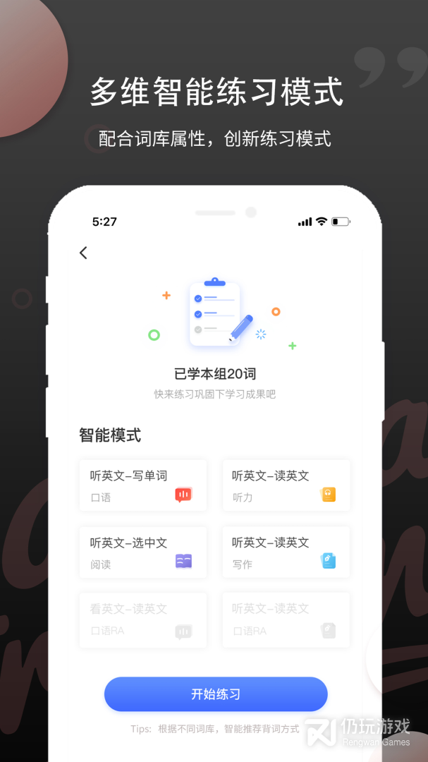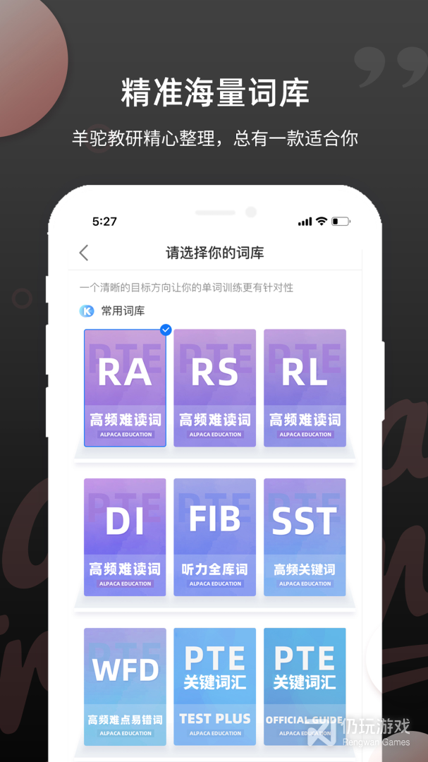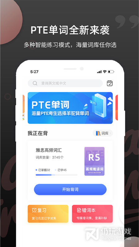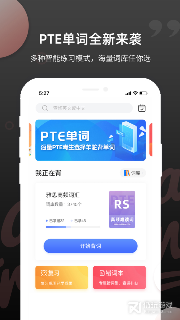 1、PTE单词app,大家看名字就知道这是一款十分不错的英语单词学习软件了,平台上面为用户提供了海量的词库,常用、官方、分级等等,所有词库都十分的齐全,用户可以在这里自由进行学习,平台上面还会为用户智能推荐最佳的练习模式,帮助用户多维度的进行单词的掌握,更有贴心的错词巩固机制,帮助用户快速进行掌握