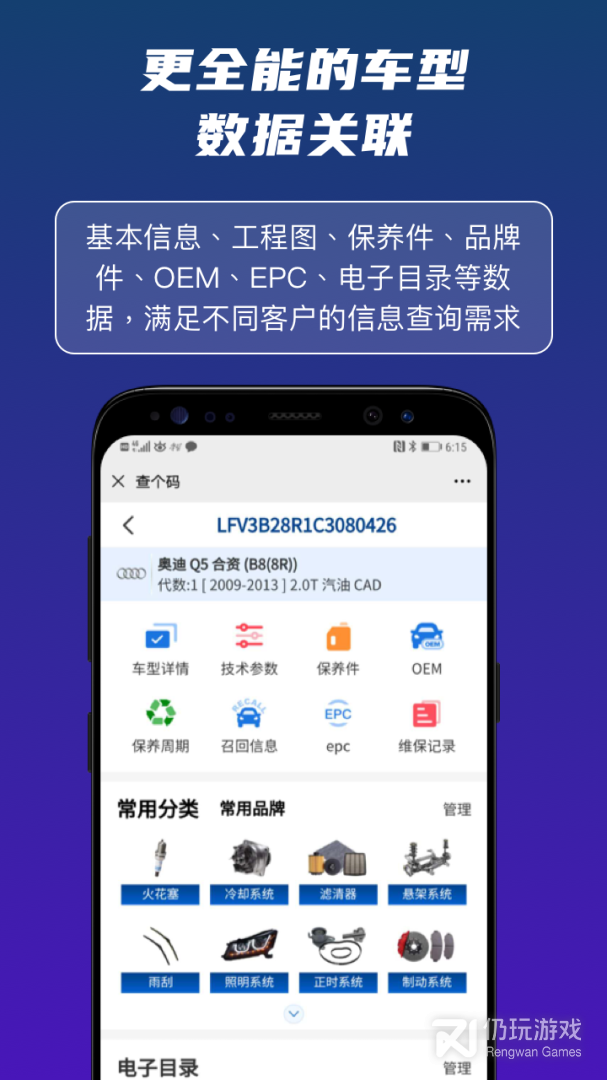 5、通过快速的VIN码识别可以查询保养建议、油品数据、易损件数据、OE数据