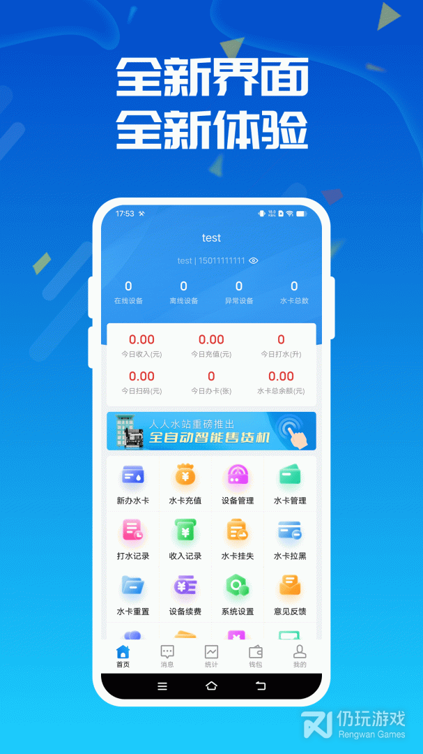 3、人人水站是物联网智能售水站客户端,软件可以远程管理水站,可以查看水站运营状况统计,水站运行状态实时监控等