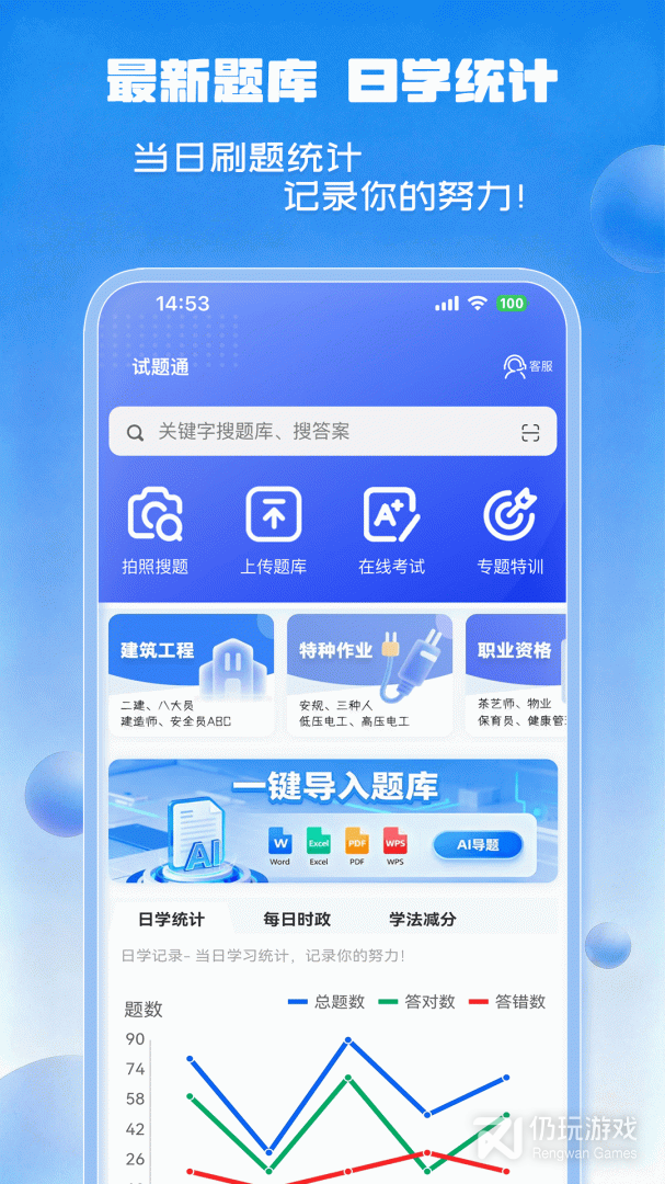 1、涵盖了各行各业的考试题目,试题通还可以导入自己的题库轻松做题,支持在线索索答案,学习各种试题库,轻松通过考试