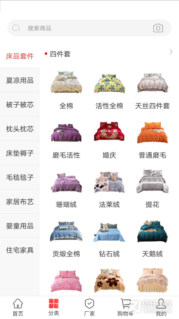 1、软件中包含了床品套件、被子被芯、枕头枕芯、毛毯毯子等等,同时还为用户提供了很多厂家,根据厂家的擅长方面分类好,给用户提供了便利,同时也给予了安心,该软件中的商品都是有质量保障的,让用户更放心