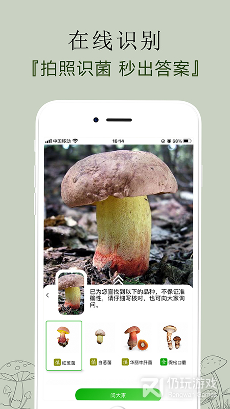 3、其主要是来对蘑菇来进行识别的。在线对蘑菇进行扫描软件就可轻松的来识别出蘑菇的种类,并且是还有当前蘑菇的相关详细信息的,让用户能知道这个蘑菇是否是可食用的,以及它的相关烹饪方式都是有非常详细的来为用户进行介绍的