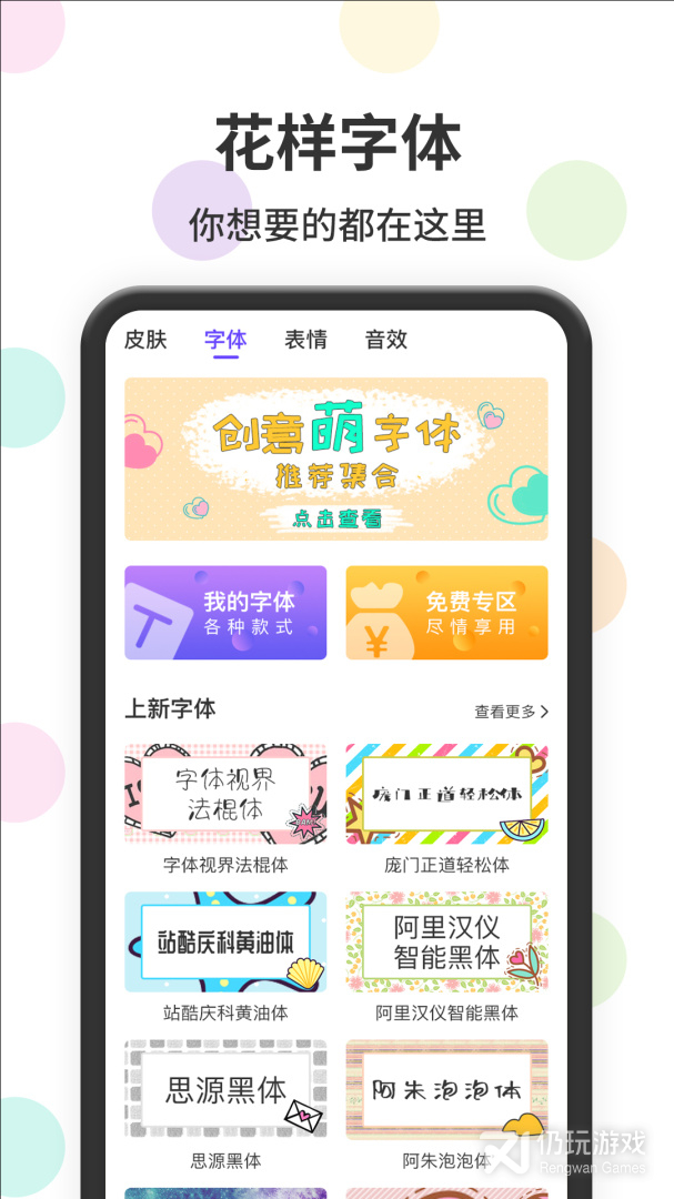 1、各种花样字体,您都能选择字体直接使用,让字体样式变得非常的丰富,个性的皮肤,可以为您添加有趣的操作体验,让您使用起来更加的便利