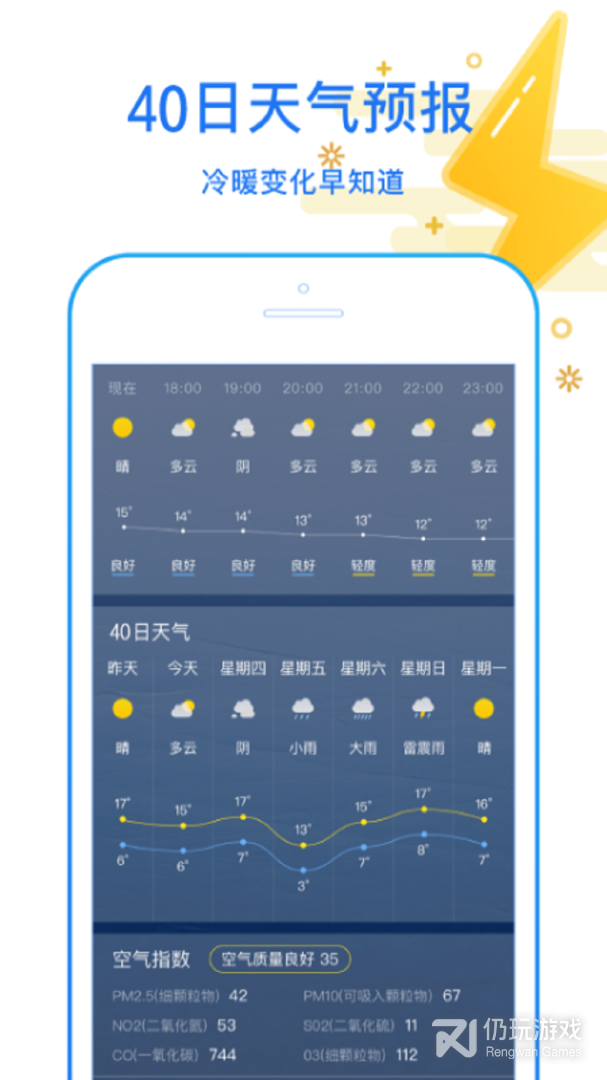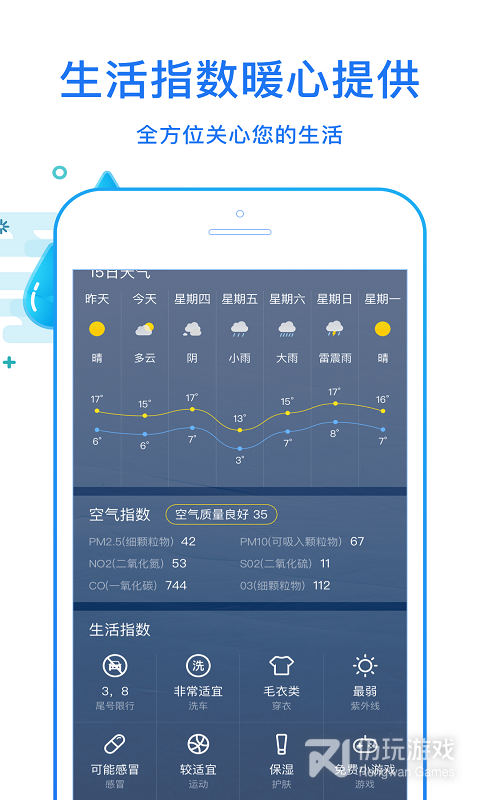 1、还有穿衣建议搭配,洗车指数,空气质量,精准预知未来一周、半个月内的天气,让你出行无忧。天气情况早知道,洗车出门再也不用担心了。不用担心天气突然变坏,会提前推送韦来天气情况