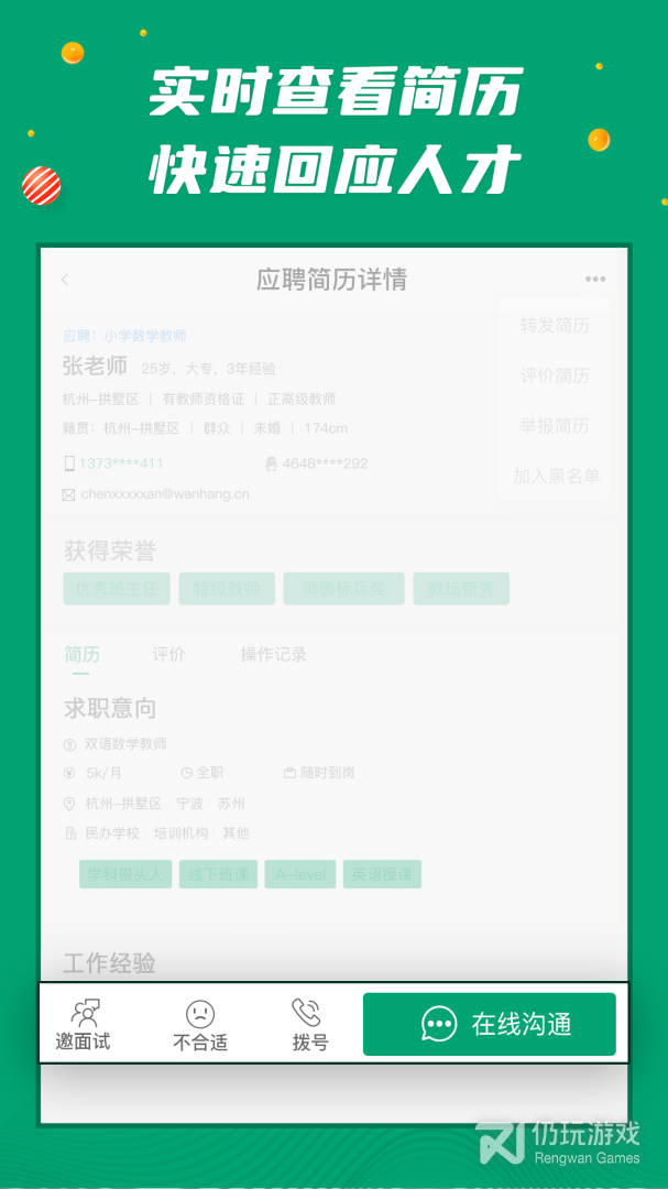 2、在查看求职简历的同时,还能与求职者在线上互动交流