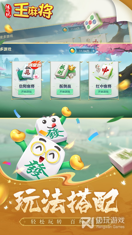王麻将打法简单、节奏快速,极易胡牌;流行与长沙,常德,益阳,株洲,岳阳等地王麻将共一百一十二张牌:有筒、索、万,外加四个红中。不带东、南、西、北风、发、白;麻将玩法涵盖“起手胡”、“杠爆”、“门前清”、“抢杠胡”,开杠就有米,多杠多赢。红中是万能牌,但不能打出。只能自摸和抢杠胡,不能吃。胡牌之后再奖码,赢到爆。