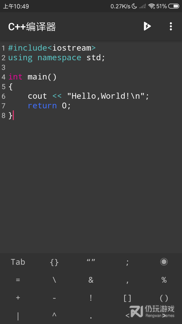 3、c++编译器是一个相当不错的计算机语言编辑器,本软件适用于移动端,功能齐全,在这里面任意输入C++代码,只要语法没错,都能正常执行,本软件使用起来非常方便,占用内存小,运行速度快,没带电脑的情况下也能敲代码,感兴趣的欢迎前来下载使用哦