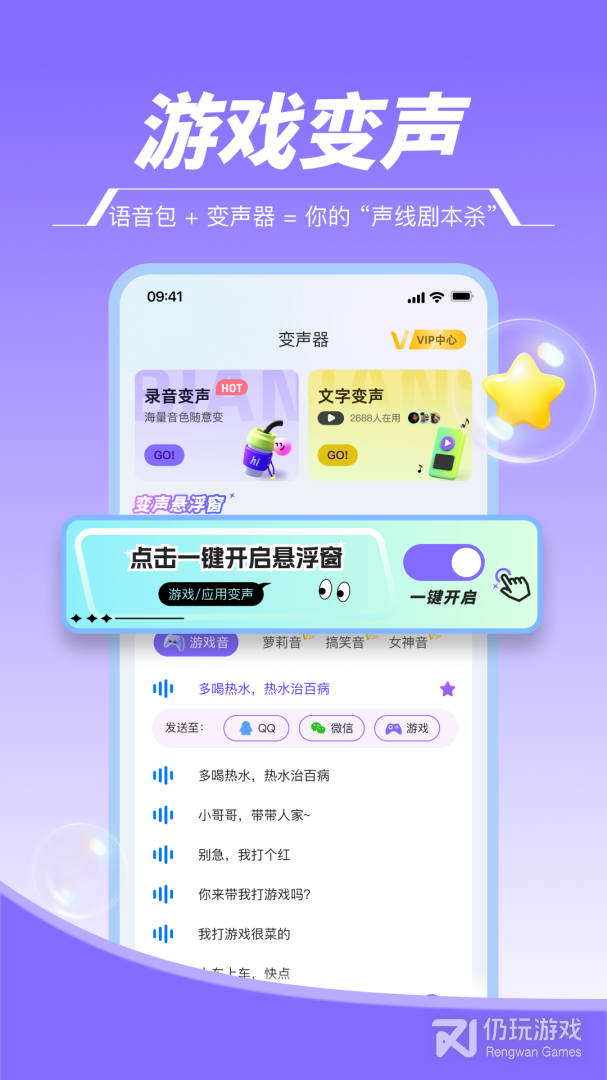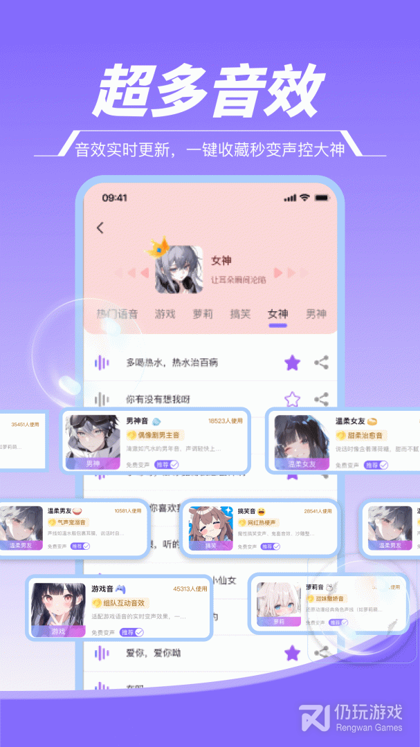 2、游戏变声器助手app专为手机游戏打造的变声器工具,多用于游戏开黑时聊天使用。海量有趣语音包一键下载使用,适用于各种游戏交友场景,很多游戏主播热门语音包这里都有。支持语音包悬浮窗,操作更便捷