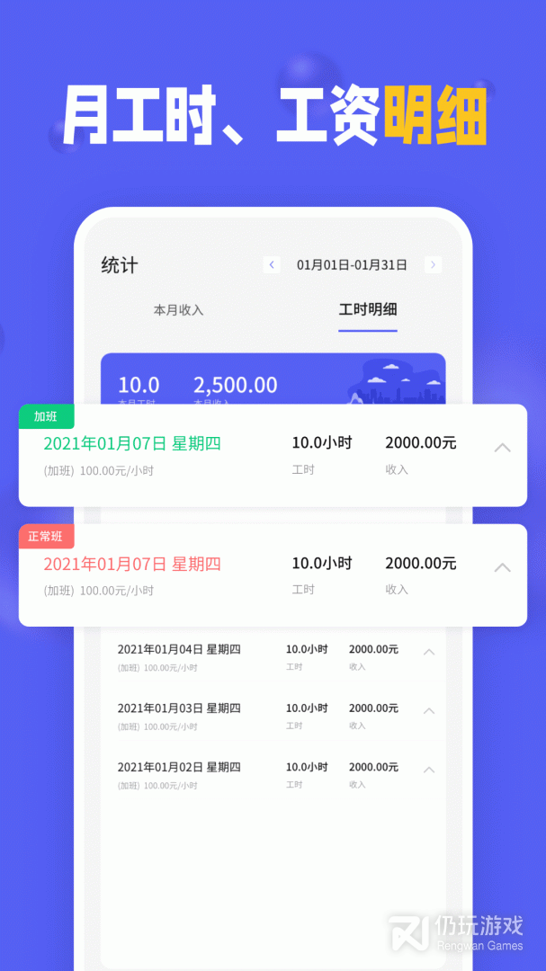 1、小时工记加班软件,自动算工资,解决小时工、临时工、兼职人员的工资计算问题,使用简单,随时随地记录加班时长、工作时长,轻松计算工资
