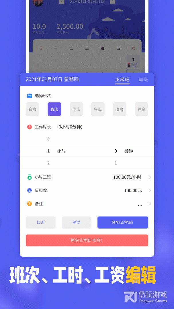 2、快速记录工作时间和加班:单击日历页面上的特定日期,一键设置工作时间和工资