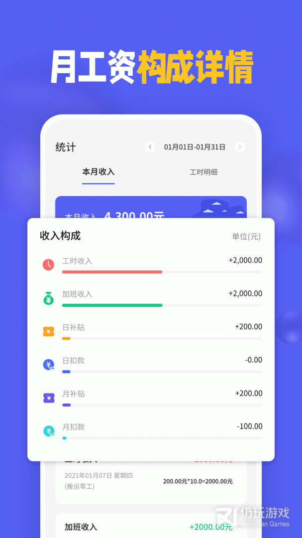 小时工记加班是一款专门针对小时工、钟点工、临时工、工厂工友,兼职人员研发的记工时、记收入、记加班软件。在日历页面,点击具体的日期,选择班次、工作,加班时长,即可计算当日工资。统计工时、加班、补贴、扣款明细一目了然。