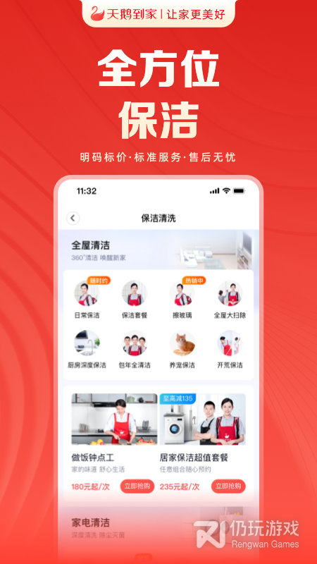 1、优质保洁 随时下单:天鹅到家采用精准智能调度,可快速匹配适合您的劳动者。您也可锁定心仪劳动者,告别分次预约的繁琐