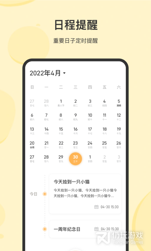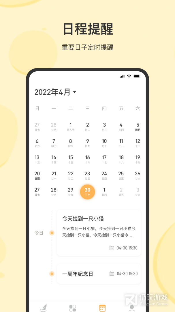 1、提供日记和基本月历功能,写下你的心情,写下多彩的生活