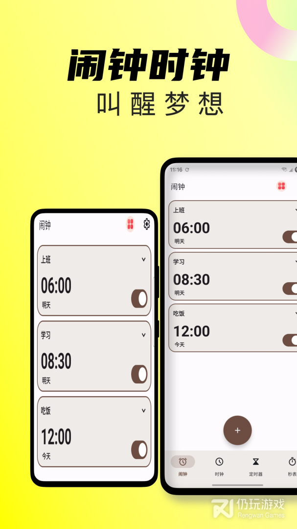 1、起床闹钟,顾名思义就是帮助叫起床的手机闹钟服务软件,用户可以这里设置多个的闹钟,这样可以帮助用户更好的安排处理自己每天的事情,不会因为睡过头而拖沓,平台上面还可以进行多彩壁纸、时间管家等超多功能,起床闹钟,赶紧关掉闹钟起床了