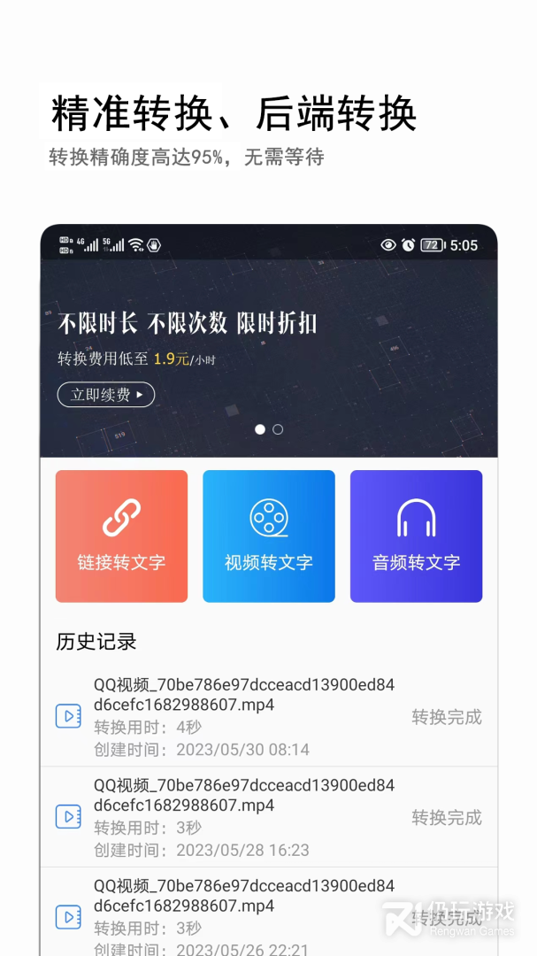音视频转文字是一款可以将视频、音频、录音转为文字的APP,能够进行大文件识别、云端处理音频、视频、录音文件,无需在APP界面等待。准确迅速,操作简单,可以实现汉语、英语转换,满足日常生活工作中视频转文字、音频转文字、录音转文字,可以学习视频课程时使用,强化学习记忆,也可以转换语音备忘录、语音通话、视频会议记录。