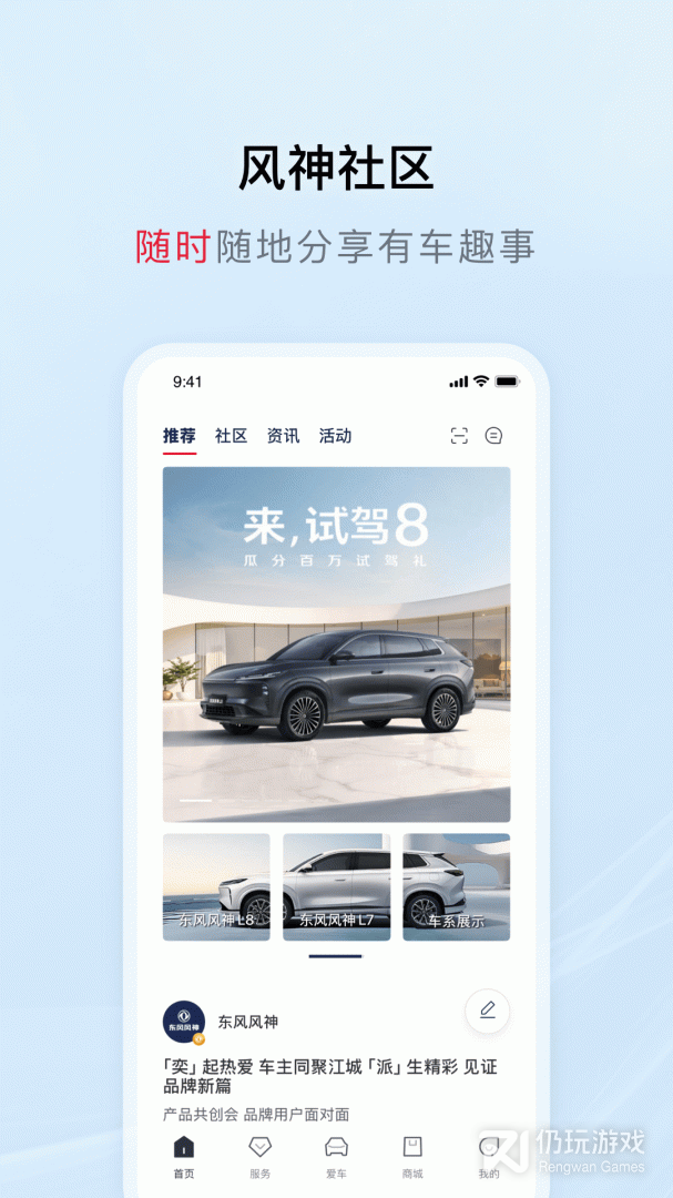 东风风神还能与其他车主客户互动聊天,发帖分享动态,体验获取积分等福利;在首页中,你可以查看最新的活动信息推送,试驾、积分活动、选车服务等一应俱全,还能发帖、点赞、回帖等等,给你不一样的汽车生活体验在选车界面中,该平台汇聚了各种车辆,其中还拥有详细的数据信息,报价、参数、配置、图片等等一网打尽;同时你可以绑定自己的爱车通过认证后就可以领券、发帖、赚积分等,更多豪礼福利等着你。